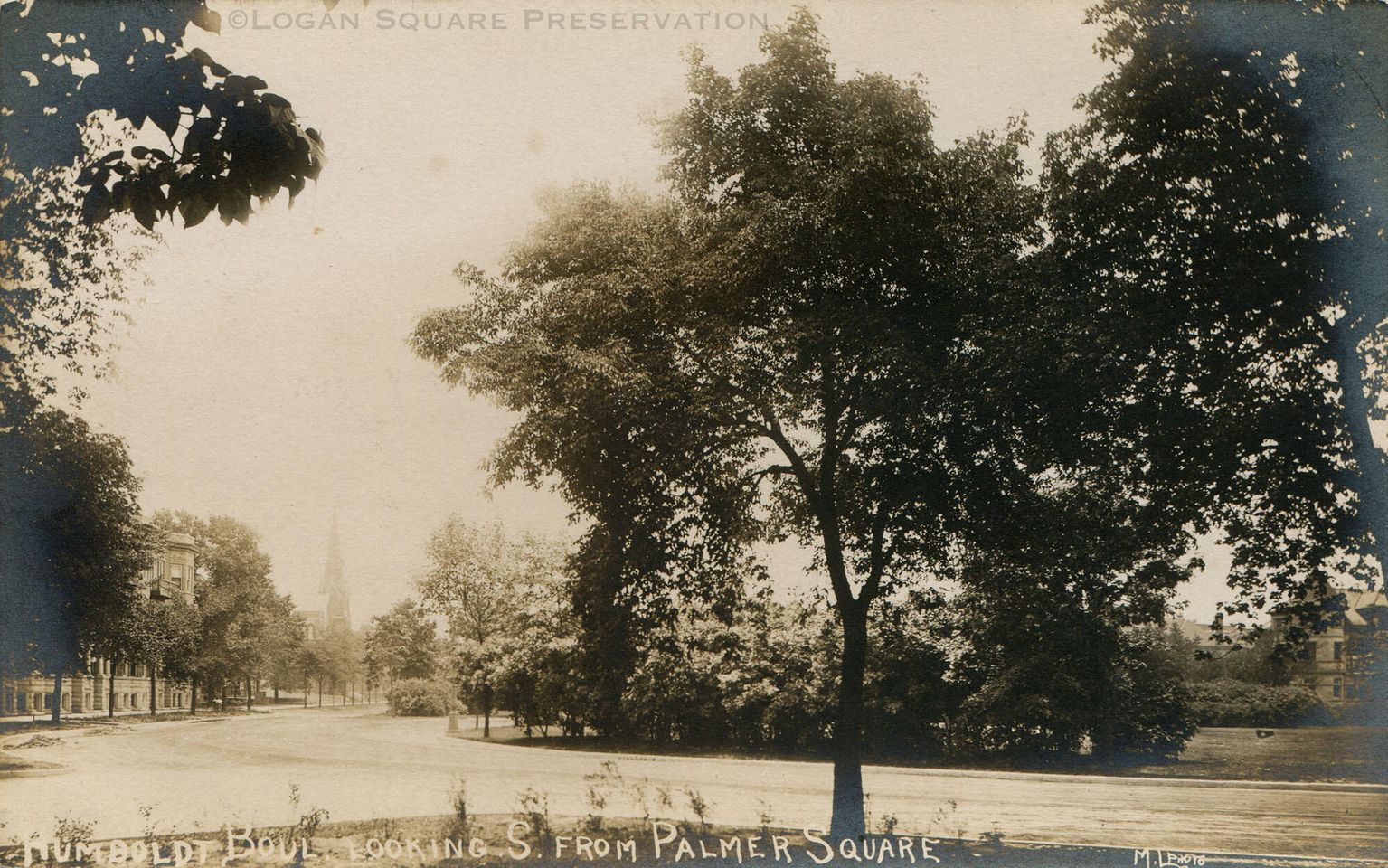 Real-photo postcard view looking west down the south side drive of Palmer Square. The Schwinn Mansion is visible behind trees on left, circa 1910.